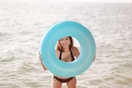 Inflatable ring in turquoise sea water. Summer vacation concept