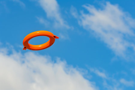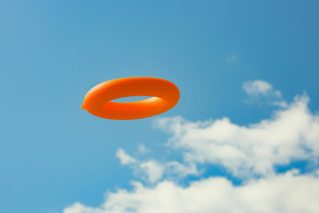 Orange inflatable ring floating in the blue sky with clouds, conceptual image