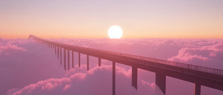 A long bridge stretches across a sea of clouds towards a bright sun at sunrise time