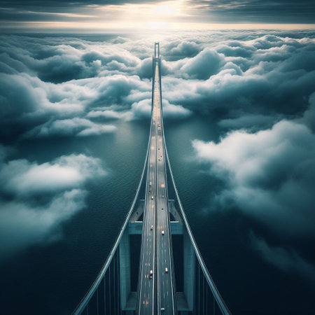 A dramatic, symmetrical view of a suspension bridge's roadway vanishing into dense, ethereal fog. The cables and towers create a sense of mystery and anticipation, evoking a journey into the unknown with a cool, muted color palette.