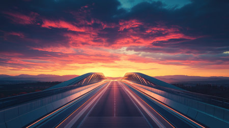The sleek structure of a modern overpass framing a vast highway and a vivid sunset sky.