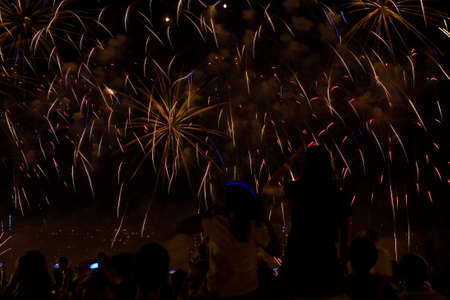 Beautiful fireworks in the dark evening sky. In the foreground are the silhouettes of spectators.