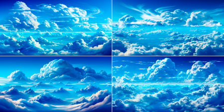 Collage of 4 photos. Artificial intelligence generated realistic blue sky with clouds. Ideal for digital artists and designers. Customizable parameters for different cloud formations.
