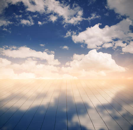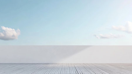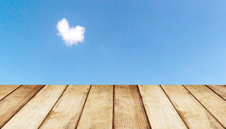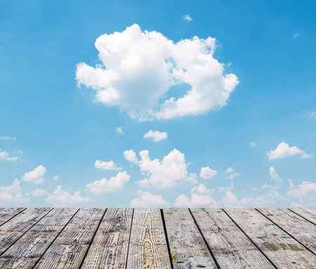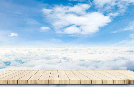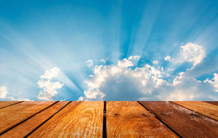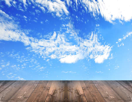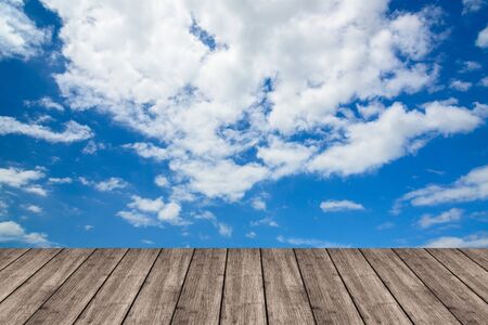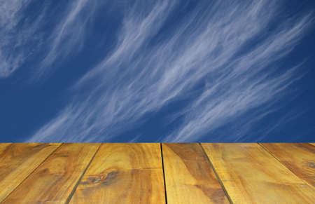 Wooden table or terrace on Deep blue sky and clouds. Space for your montage, For product display.
