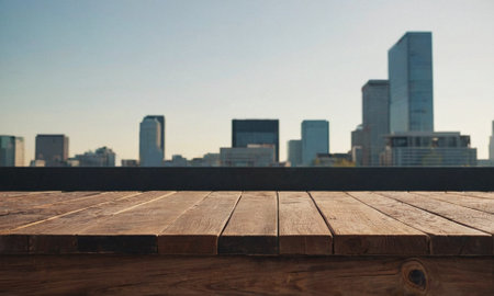 wooden top table with Cityscape - High-rise buildings on background for product display