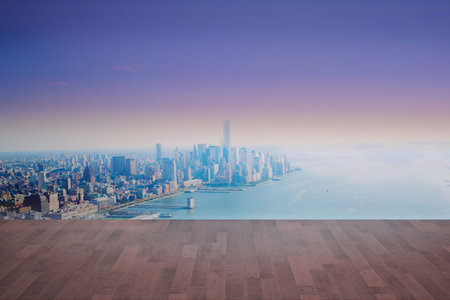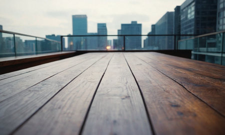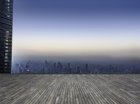 Empty old wood floor with blurred aerial view of cityscape on warm light sundown, for your product display montage