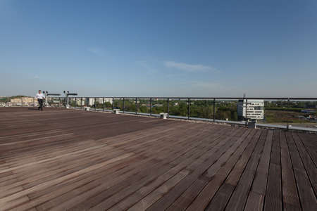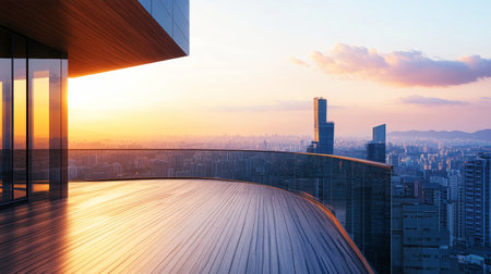 Panoramic Bangkok skyline view, wooden observatory deck on rooftop, daytime. Luxury Asian corporate and residential lifestyle. Financial city downtown, real estate. Product display mockup empty roof