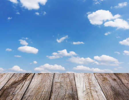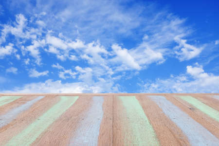 Empty top of old blue wooden table and view of blue sky with fluffy white clouds on background. Picture can used for display or montage your products.