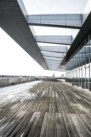 flat design is showing panoramic city skyline over water with wooden deck front. Urban, waterfront, skyline, modern, minimalist, scenic, outdoor