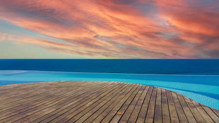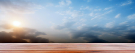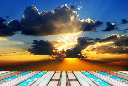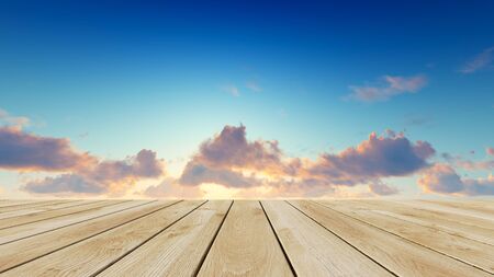 wooden floor and beautiful sky at sunset, background image, freedom concept