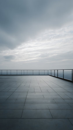 A scenic view of a colored wooden table overviewing the beautiful coast under a cloudy sky