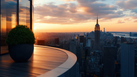 Professional film camera on rooftop terrace at sunset with modern city skyline. Cinematic outdoor setup capturing creative filmmaking and urban architecture atmosphere.