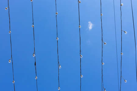 Light bulbs rows on wires against clear blue sky background