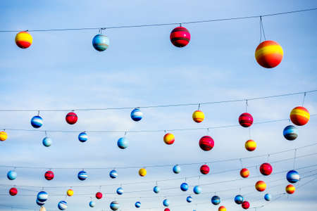 Colorful ribbons and festival lights on clear blue sky summer background