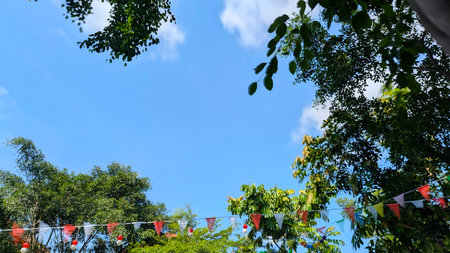 A vibrant blue sky with scattered white clouds, framed by lush green trees and colorful bunting, creating a festive outdoor ambiance.