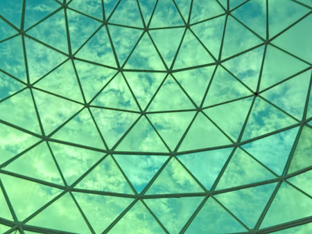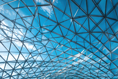 Architectural shot looking upwards at a geometric glass ceiling against a bright blue sky
