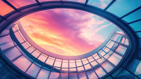 Captivating view featuring a circular skylight that encases a stunning sunset filled with vibrant colors, showcasing modern architectural design and tranquil atmosphere.