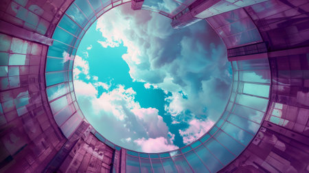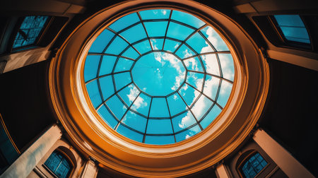Capture the beauty of architecture with this breathtaking dome skylight view showcasing vibrant blue skies and soft white clouds.