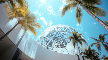 Buckminster Fulleraes Flyaes Eye Dome under the clear Miami sky, surrounded by palm trees and contemporary art pieces in the Miami Design District