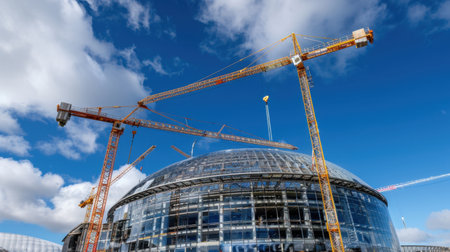 A dynamic construction site featuring towering cranes and a glass facade, capturing the essence of modern architecture under a vibrant blue sky.