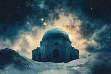 Observatory dome stands majestically under a vibrant, star filled sky, surrounded by snowy terrain and cosmic clouds, creating a serene scene