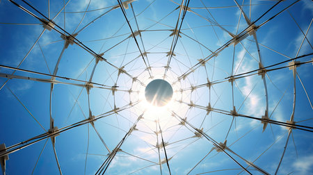 A stunning image of an intricate geometric dome structure with a blue tint, showcasing a complex network of steel beams and trusses. The architectural marvel is captured from the inside, highlighting the beauty and complexity of modern engineering.