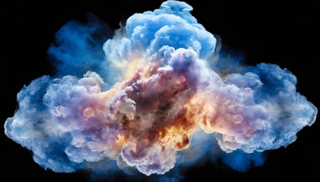 An artistic rendering features a vibrant explosion of layered clouds in shades of blue, orange, and purple. The dramatic lighting emanates from the center. This composition suggests a dynamic, surreal environment. The image is suitable for various creative applications and graphic design projects.