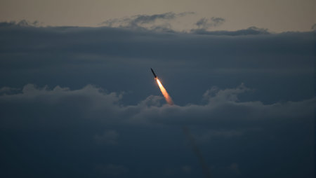 Dramatic missile launch in dark sky with orange trail