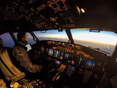 Flight Deck of small commercial aircraft.The pilots (cockpit crew) prepares for landing at the airport.