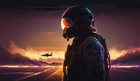 Close-up portrait of a man pilot wearing helmet in cockpit of fighter jet. Military aircraft.