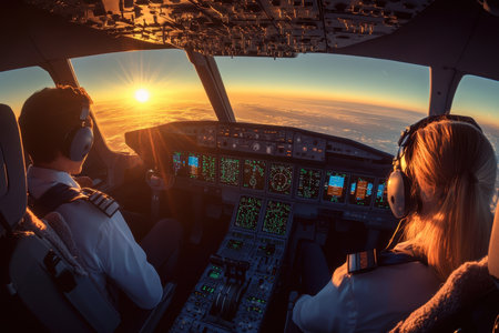 Two pilots are focused on flying the aircraft while enjoying a stunning sunset view.