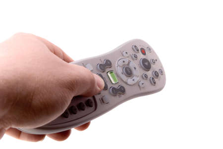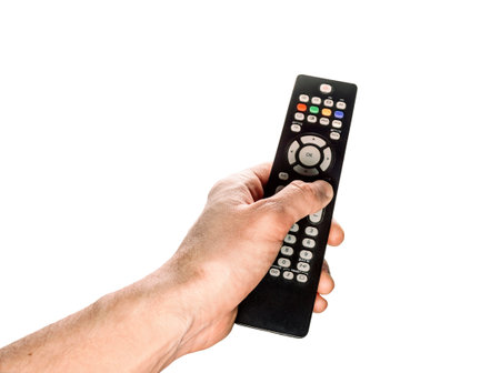 Hand holding television remote control isolated on white background
