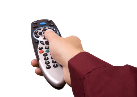 Hand pressing remote control isolated on white background with clipping path