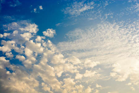 Bright blue sky background, lighted clouds. Nature composition. Panoramic sunset scenery, sparkle sun and clouded sky.