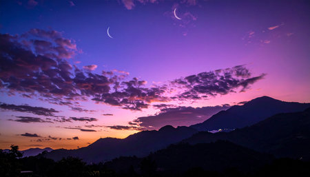 Beautiful sunset over the mountains with clouds and a crescent moon