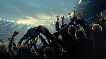 Creative artwork. Football fans raising scarves and cheering inside packed stadium. Concept of intense excitement, team loyalty, live match atmosphere, sports marketing visuals, and fan culture ads.