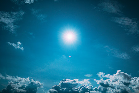 Sun Blue sky background with white clouds.Cloudscape. Sunny day. Cumulus white cloud.