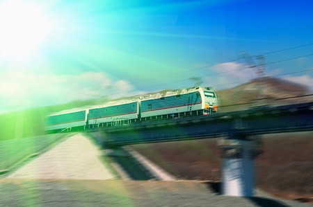 Fast train passing under a bridge on a lovely summer day (motion blurred image)