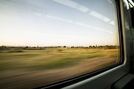 Enjoying a coffee while traveling through scenic autumn countryside seen from a train window. Train journey, European autumn landscape rolling, coffee cup
