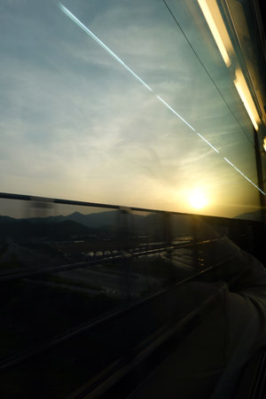 view of the train and the station from inside the carriage at dawn while the sun appears in the sky