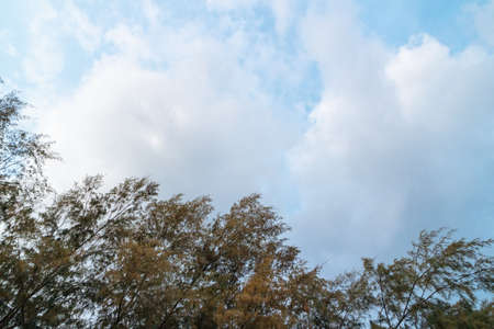 Nature autumn tree branch on sky and white clouds abstract background. Ecology environment and travel relax concept. Vintage tone filter effect color style.