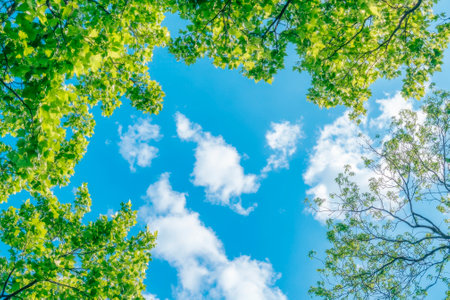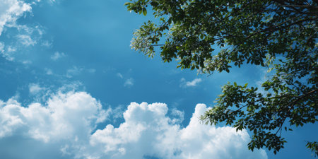 Green tree foliage with fresh leaves against a clear vivid blue summer sky featuring soft white cumulus clouds, creating a peaceful scene for backgrounds and copy space