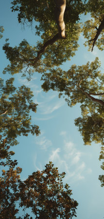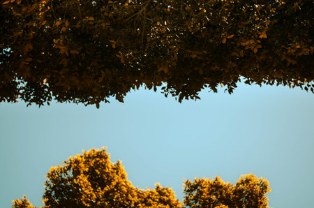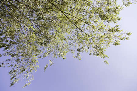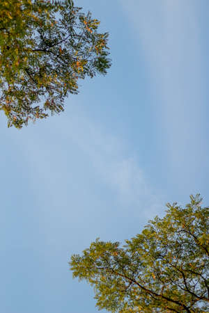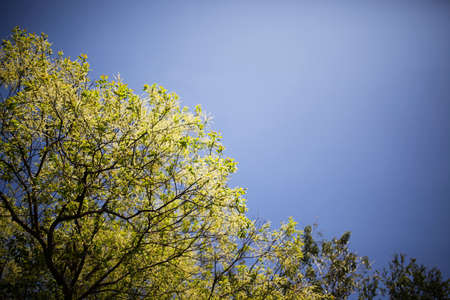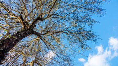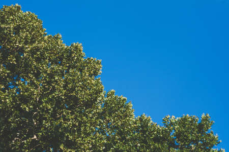 Low angle of a tree canopy with blue sky in the background. Image with copy space.