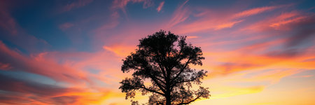 A large, dark tree is centered in the frame, its branches stretching towards a colorful sunset