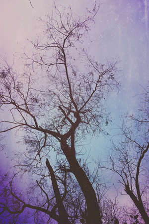 Early sunset in cold weather, winter blue sky with lifeless trees and dry branches