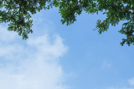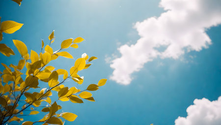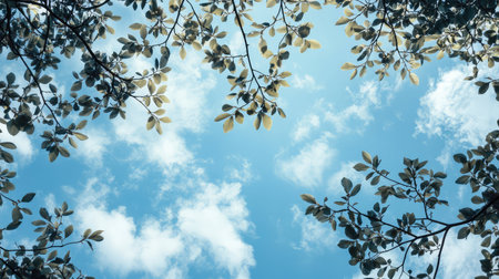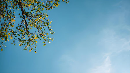 Tree leaves on blue sky background with copy space for writing text AI generated image