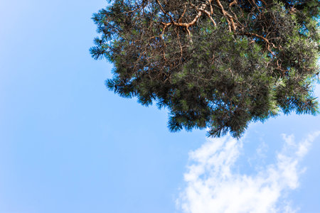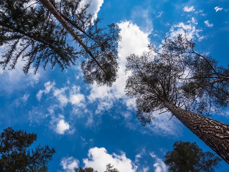 Pine forest up view on a sunny day. Warm yellow sunlight. Blue sky.