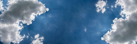 Panoramic view of blue sky, bright cloudy day.