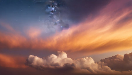 A beautiful blue sky with fluffy clouds and a mountain range in the background. The sky is filled with stars, giving the image a serene and peaceful atmosphere