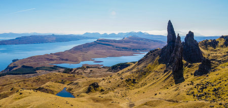 Famous exposed rocks Old Man of Storr, north hill in the Isle of Skye island of Highlands in Scotland.